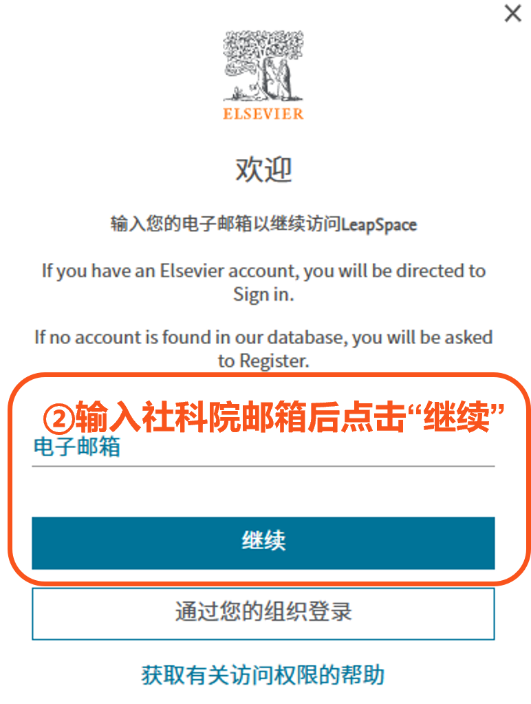 2.在“欢迎”界面上,输入您的机构邮箱并点击“继续”(如果您此前已经用同一个邮箱在ScienceDirect或者Cell Press平台注册账户,在点击“继续”后直接输入密码即可使用LeapSpace)。